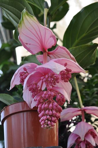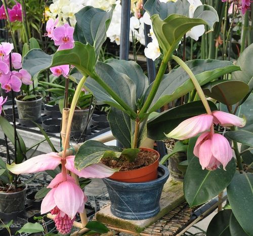 Мединилла составляет гордость любой коллекции, но ей требуется теплый парник или оранжерея. У этого высокого (до 1,4 м) тропического кустарника кожистые попарно расположенные листья. Поздней весной образует великолепные соцветия. Требовательна к температурному режиму, нуждается в высокой влажности воздуха.