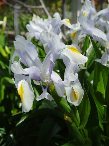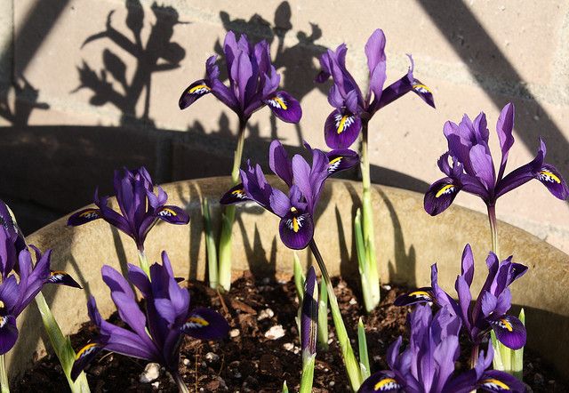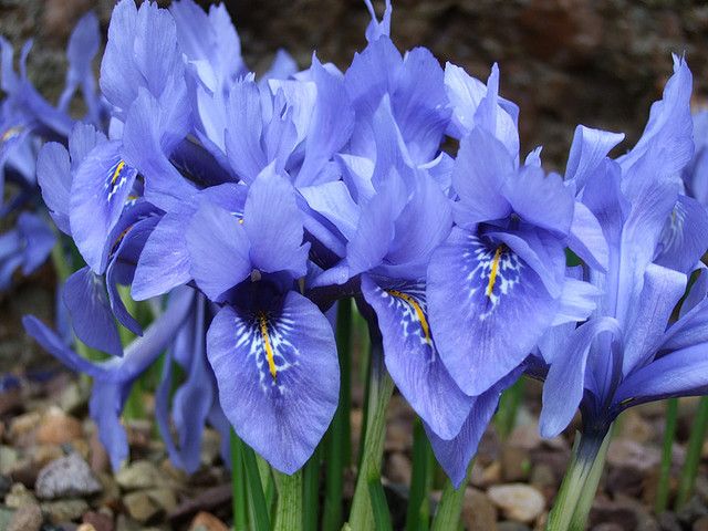 Виды и сорта: Ирисы группы Reticulata — неотъемлемый элемент альпийских садиков, причем особой популярностью пользуются душистые И. Дэнфорд (I. danfordiae) с желтыми в коричневую крапинку цветками и еще более распространенный И. сетчатый (I. reticulata) с голубыми, розовато-лиловыми или пурпурными цветками диаметром 8 см с оранжевыми или желтыми отметинами. Сорта И. сетчатого включают «J.S. Dijt» (пурпурный с оранжевыми отметинами) и «Cantab» (бледно-голубой с оранжевыми отметинами). Еще крупнее цветки у более раннего И. пестровидного (I. histrioides) «Major»; цветки голубые с белыми и золотистыми отметинами. Ирисы группы Reticulata сажают в сентябре-октябре на глубину 8 см. Ирисы группы Xiphium выращивают в бордюре. Раньше других (в июне) зацветают голландские гибриды, из которых наиболее популярны желтый И. «Lemon Queen» и голубой И. «Wedgwood». Цветки И. широколистного (I. latifolia), или английского ириса, диаметром 12 см распускаются несколько позже. Самым последним в этой группе — в июле — цветет И. мечник (I. xiphium), или испанский ирис, с голубовато-фиолетовыми цветками. Эти ирисы сажают в сентябре-октябре на глубину 10-15 см. Маловыносливым ирисам группы Juno нужна богатая гумусом почва и солнечное место. К этой группе относятся кремовый с желтым И. бухарский (I. bucharica) высотой 30 см и лавандовый с белым И. великолепный (I. magnifica) высотой 60 см. Сажают в сентябре на глубину 5 см.