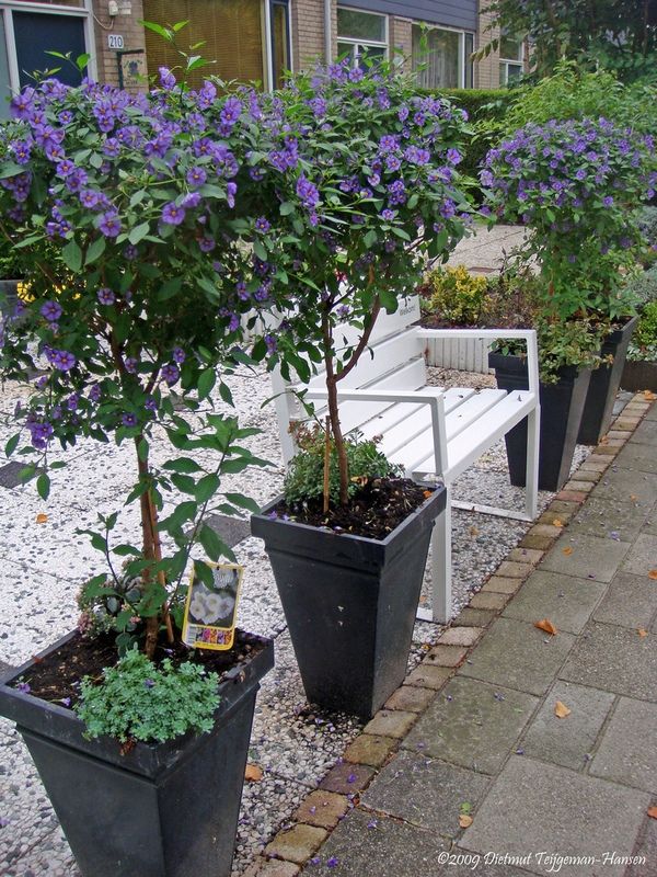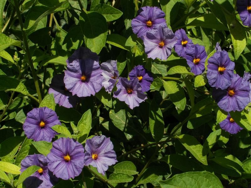Паслен горечавковидный (Solanum rantonnetii) называют картофельным деревом. Вообще-то, урожая картошки с него не получишь, просто цветки его напоминают картофельные. Во время долгого периода цветения деревце все покрыто яркими, буквально сияющими синими цветками с желтой серединкой. Выглядит оно на редкость нарядно и декоративно. Правда, полюбоваться такой красотой вам можно будет только тогда, когда растение будет выставлено на яркое солнце.
