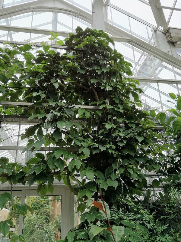 Виноград Вуанье или Тетрастигма Вуанье (Tetrastigma voinierianum) - гигант в семействе виноградовых. Взрослый лист достигает в поперечнике 30 см, состоит из пяти листочков с блестящей поверхностью и пильчатым краем. В теплице или оранжерее растение буйно разрастается - это удобно, если нужно закрыть голую стену, но может представлять опасность для растущих поблизости нежных растений. Тетрастигма никогда не была особенно распространена в комнатной культуре из-за своих размеров и буйного роста. Она плохо переносит теплый сухой воздух, при выращивании помещении лучше держать ее в прохладе. Ей требуется прочная опора и простор за год она вырастает на 2-2,5 м.