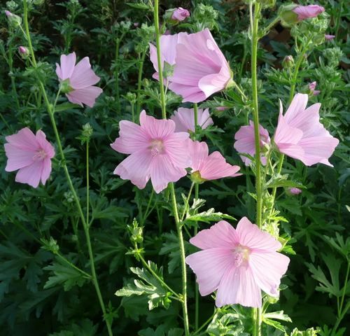 Виды и сорта: Наиболее распространен П. мускусный (М. moschata) высотой 60 см, цветущий розовыми или лавандовыми цветками диаметром 5 см с июня по сентябрь. Популярен белоцветковый сорт «Alba». Есть также несколько интересных сортов П. лесного (М. sylvestris): «Mauritania» (1,5 м) с крупными красновато-лиловыми цветками с гофрированными лепестками и «Primley Blue» (20 см) с небесно-голубыми цветками. У сорта «Zebrina» сиреневые цветки с темной серединкой.