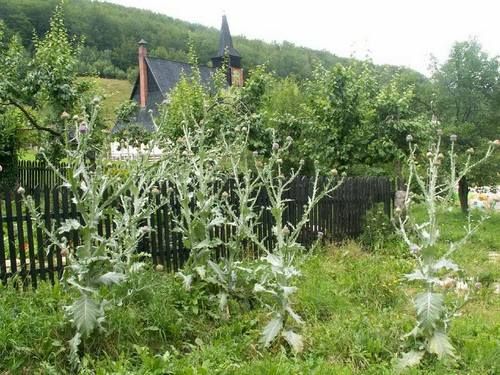 Крупное эффектное колючее растение для заднего плана обширного бордюра. В первый год образует плоские розетки листьев, на второй год отрастают высокие цветоносы с серебристыми листьями. Чтобы ограничить распространение самосевом, отцветшие корзинки удаляют.