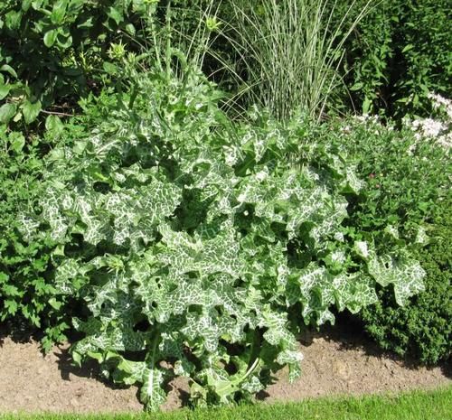 Соцветия-корзинки этого удивительного растения состоят из многочисленных крошечных светло-лиловых цветков, окруженных длинными колючими листочками обертки, однако ценят этот двулетник не за соцветия, а за блестящие колючие листья с белыми жилками, из-за которых растение получило народное название «остро-пестро». Листья собраны в прикорневую розетку и достигают 45 см в длину и 25 см в ширину.
