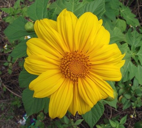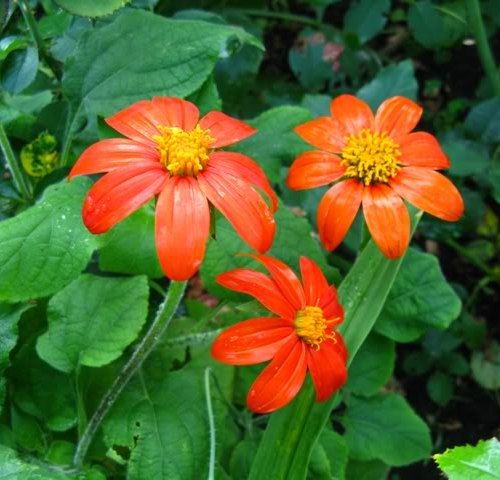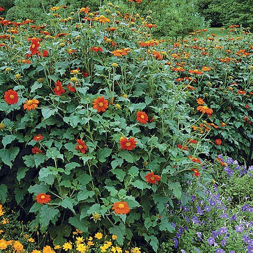 Виды и сорта: Т. круглолистная (Т. rotundifolia), иногда называют Т. прекрасная (Т. speciosa), высотой 1,5 м цветет в июле-сентябре соцветиями диаметром 8 см с оранжево-красными сверху и желтыми снизу «лепестками» и желтой серединкой. Сорт «Torch» не такой рослый. У сорта «Yellow Torch» цельножелтые, у сорта «Sundance» и у самого популярного и компактного (75 см) сорта «Goldfinger» — оранжевые соцветия.