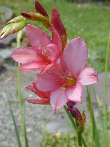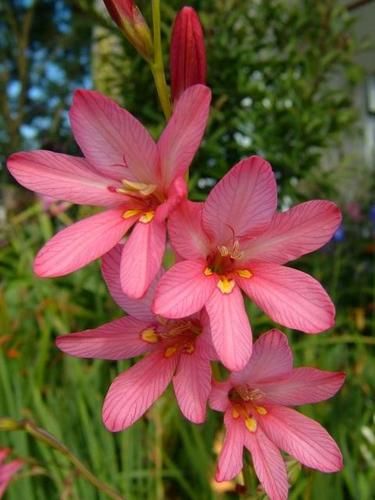 У тритонии такие же, как у ее родственниц крокосмии и иксии, ремневидные листья и тонкие цветоносы с ярко окрашенными звездчатыми цветками. Это еще менее выносливое растение, чем крокосмия, в открытом грунте его можно выращивать только в районах с мягким климатом. Клубнелуковицы высаживают в сентябре на глубину 5 см, на зиму почву над посадками мульчируют, в начале весны мульчу снимают.