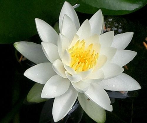 Лепестки белые до 30 штук в соцветии, тычинки желтые. Цветоносы находятся над водой. Подходящее растение для небольшого пруда, разрастается до 0,5 м, на солнечном месте обильно цветет душистыми звездчатыми цветками. Листья почти круглые, бледно-зеленые сверху и красные снизу, диаметр 15 см.