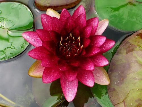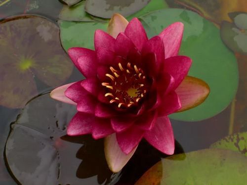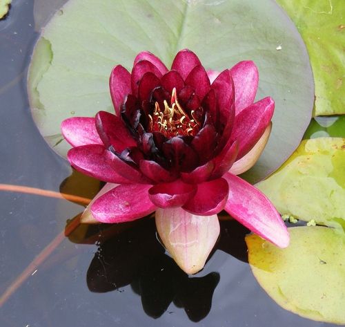 Кувшинка селекции Перри Д. Слокума 1994 г. Лепестки темно-красные, в середине почти черные. Цветок диаметром 12-15 см. Листья круглые, темно-зеленые, часто согнуты в вверх, до 20 см в диаметре. В данное время самый темный сорт кувшинок.