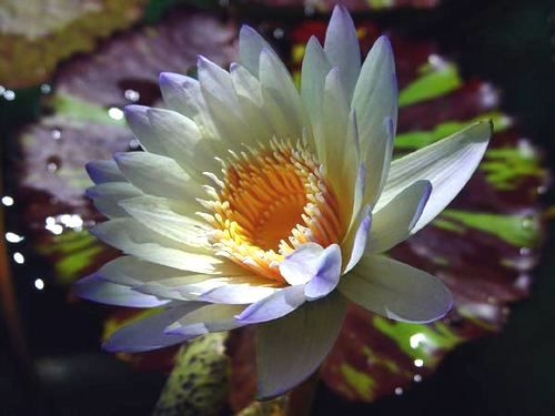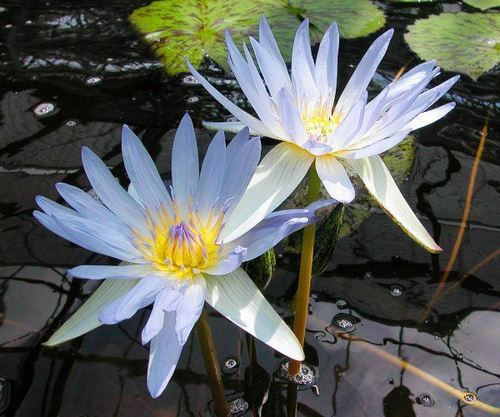 Кувшинка селекции Wood 1983 г. Лепестки светло-голубого цвета, тычинки от оранжевого до желтого цвета с голубыми кончиками. Цветок звездовидный, диаметр 12-16 см. Соцветия находятся над водой. Листья овальные, темно-зеленого цвета с красно-коричневыми пятнами, диаметром до 30 см. Край листа слегка волнистый и зубчатый. Прекрасный выбор для мини-пруда или большой емкости. Теплолюбива.