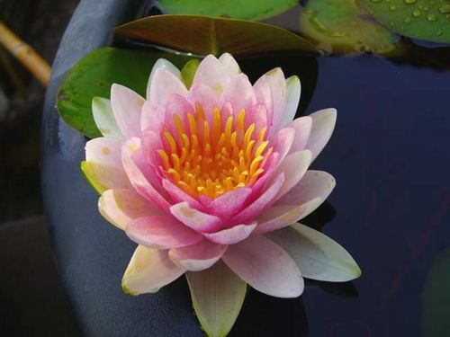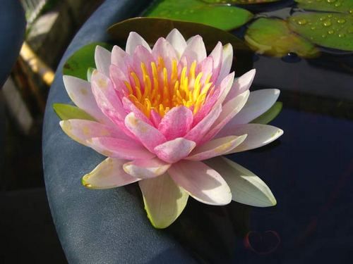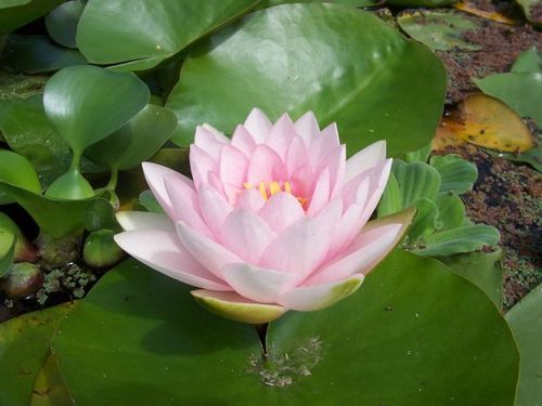 Кувшинка селекции Отто ван дер Вельде 1989 г. Цветок светло розовый, в середине темнее, 20 см в диаметре, форма цветка чашевидная формы, соцветие выступает над поверхностью воды. Листья почти круглые, темно-зеленые, 26 см в диаметре.