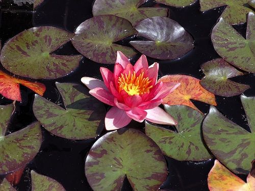 Кувшинка селекции Латур-Марлиака 1912 г. Цветок большого диаметра для кувшинки такого размера, диаметр колеблется от 5 до 8 см к концу цветения. Цвет меняется от желтовато-медного (1-й днь) до красно-оранжевого (3-4-й день). Листья 8-10 см в диаметре, овальные; пестрые, с красновато-коричневыми пятнами при при выращивании на солнце, разрез глубокий и широкий. Требует много солнца и теплой воды, не очень активно разрастается, подходит для небольших баков и контейнеров.