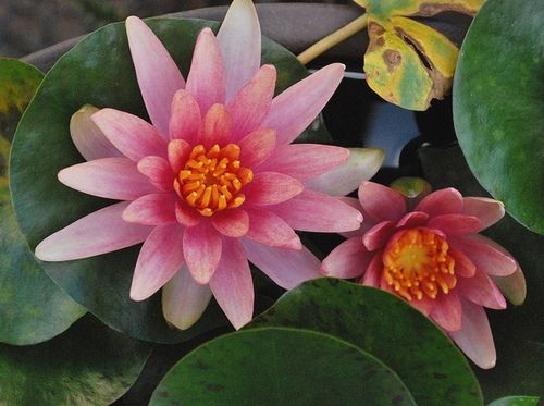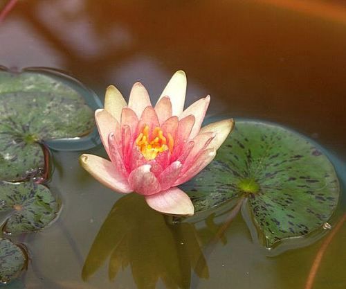 Кувшинка селекции Кирка Строна 1993 г. Цветок в первый день медно-оранжевый с светло-розовой серединкой, затем цветок становится краснее с каждым днем, цветок 8 см в диаметре. Листья круглые, темно-зеленый с большим количеством коричневых пятен, разрез очень широкий, размер листа около 10 см в диаметре. Обильное цветение, подходит для горшков и мини-прудов.