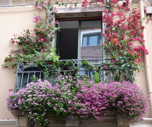 Если ваша терраса или балкон выходят на восток или юг, то разнообразие ваших растений зависит только от вашей фантазии и кошелька. Для тенистых мест замечательно подойдут группы растений неприхотливых и традиционных – бегоний и фуксий. Посадить их лучше всего в подвесную корзину или кашпо. 2-3 ампельные бегонии, 1-2 ампельные фуксии, мята (1-2 шт.), 1-2 плюща с пёстрой окраской – всё это вполне поместиться в корзине диаметром 35-40 см. Сочетание разных форм - лиственных и цветущих придаст композиции оригинальность и завершенность. Очень декоративны и неприхотливы ампельные сурфинии, они не боятся ветра, дождя, цветут практически всё лето. Очень подходят для посадки в ящиках или подвесных корзинах на продуваемых балконах.