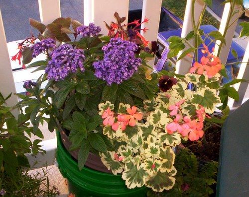 Не стоит забывать про удобство полива вашего садика: свободный подход к растениям продумайте заранее. Избыток воды нужно собирать в поддоны, чтобы не попадал на нижние растения. На дно балконных ящиков, без дренажных отверстий, кладём куски битых горшков или керамзит слоем в 3 см. Поверх следует уложить слой кокосовых волокон, которые замечательно впитают излишки воды и создают проветривание для корней растения. Такие волокна продаются в виде спрессованных брикетов в специализированных магазинах, перед посадкой их размачивают. Еще один совет – чтобы сильно разросшиеся растения не угнетали другие цветы (например – мята), нужно регулярно их обрезать, увядшие цветки растений убирать.
