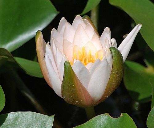 Кувшинка селекции Кирка Строна 1993 г. Цветок кремовый с розовым отливом, форма цветка чашевидная широкая, цветок 6-8 см в диаметре. Соцветие располагается над поверхностью воды. Листья почти круглые, оливково-зеленые, край листа загибается вверх, диаметр листа 10-12 см.Обильное цветение, хорошо подходит для небольших прудов.