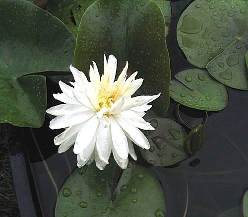 Кувшинка селекции питомника Перри Гарденс 1998 г. Цветок снежно-белый, очень густо-махровый, 14-16 см в диаметре. Листья овальные, вытянутые, от темно-зеленого до оливкового цвета, размер примерно 25x20 см. Редкий, но на мой взгляд, один из самых красивых белых сортов.