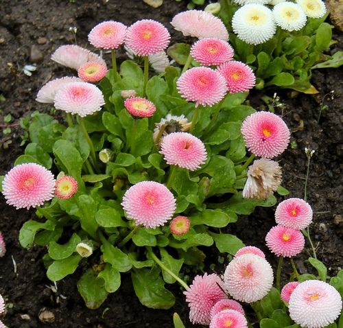 Виды и сорта: Исходный вид — М. многолетняя (В. perennis) высотой 8-20 см, разрастается в ширину до 15 см; цветет в апреле-июле. У сортов «Monstrosa», «Radar Red», «Goliath», «Robella» и «Super Enorma» крупные (до 5 см в диаметре) соцветия. Многие предпочитают миниатюрные сорта с многочисленными соцветиями диаметром 1-2,5 см: «Lilliput» (красный), «Rob Roy» (красный), «The Pearl» (белый) и замечательный сорт «Dresden China» (розовый). Соцветия сортов «Spring Star» и «Pomponette» похожи на помпоны; у высокорослого сорта «Habanera Blush» белые перьевидные «лепестки» с красными кончиками. Линия миниатюрных сортов серии «Carpet», отличается правильной формой.