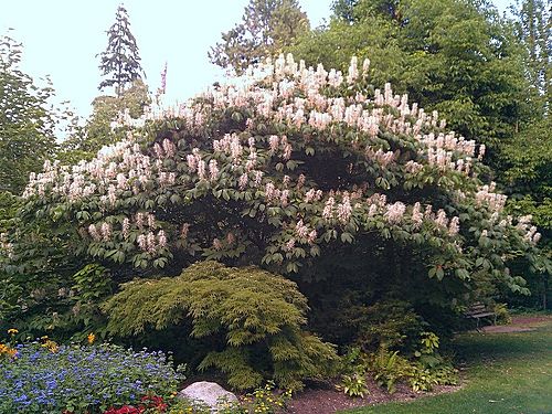 Виды и сорта: Наиболее популярен К. к. мелкоцветковый (A. parviflora). Его плотные округлые кусты достигают 2-2,5 м в высоту и 3 м в диаметре. Цветет в июле-августе 25-сантиметровыми, похожими на «ерш» для мытья бутылок соцветиями-свечами из белых с красными тычинками трубчатых цветков. Осенью листья приобретают красивую золотистую окраску. Иногда в продаже можно встретить гораздо более рослый К. к. Павия (A. pavia). Его алые цветки распускаются в июне-июле. Наиболее густой красный цвет у сорта «Sanguinea». Чтобы найти растение, цветущее в мае, придется просмотреть не один каталог в поисках красочного К. к. незамеченного (A. neglecta) «Erythroblastos» (6 м), молодые розовые листья которого с возрастом становятся желтыми, потом зелеными, и наконец оранжевыми. Цветки желтые.