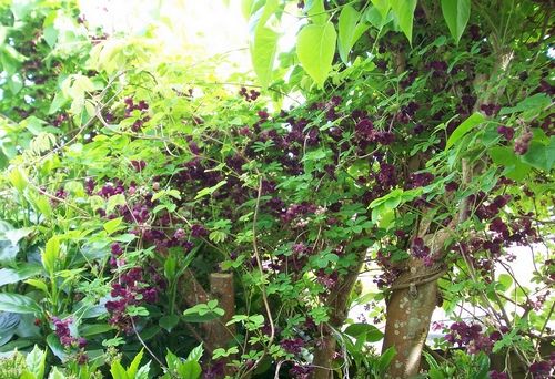 Сильнорослая лиана родом из Восточной Азии. В первые несколько лет после посадки растет медленно, но укоренившись, быстро разрастается. Лист состоит из нескольких листочков, а соцветие — из нескольких мелких душистых темно-малиновых цветков. Цветки ничем не примечательны, что с лихвой компенсируется обилием цветения. Крупные продолговатые мясистые плоды съедобны, но завязываются крайне редко. В мае удаляют сухие и лишние стебли.
