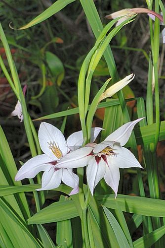 Виды и сорта: Может встречаться под названием А. двуцветная (A. bicolor murieliae), или А. «Murieliae» в большинстве справочников называется гладиолус красивоцветковый (Gladiolus callianthus). Звездчатые цветки диаметром 5 - 8 см располагаются на цветоносе высотой 90 см над пучком мечевидных листьев. У основания каждого листочка околоцветника есть отчетливая пурпурная отметина. Зимой клубнелуковицы хранят в сухом непромерзающем помещении.